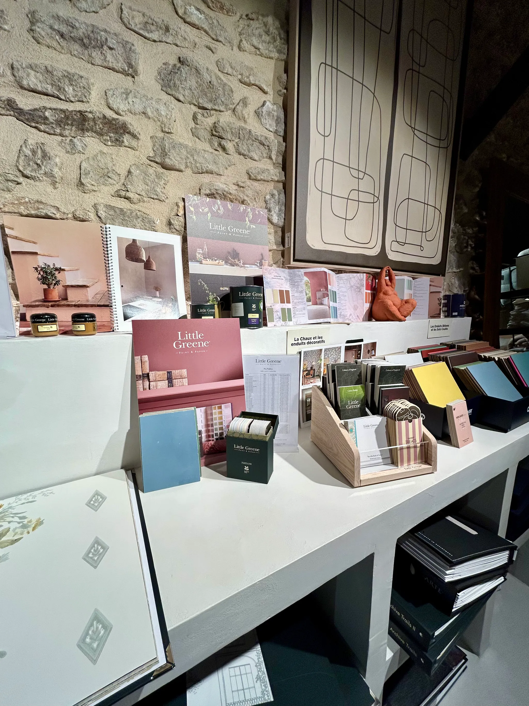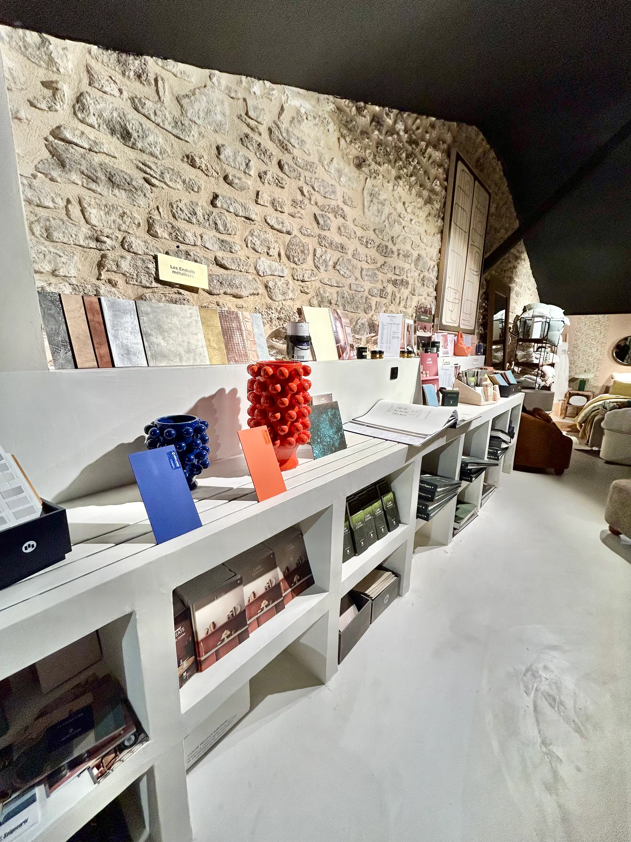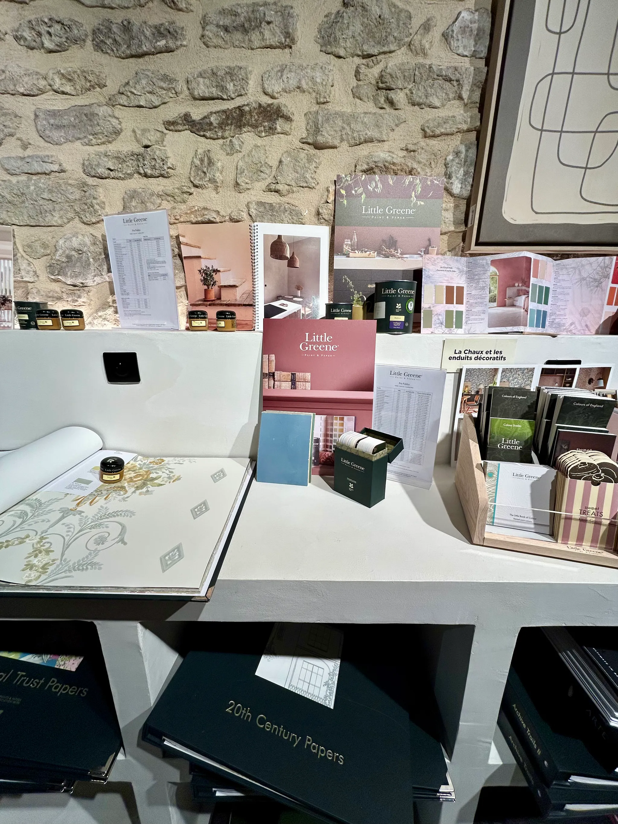Découvrez notre showroom unique avec sa machine à teinter Little Greene et une sélection complète de matériaux et échantillons.
