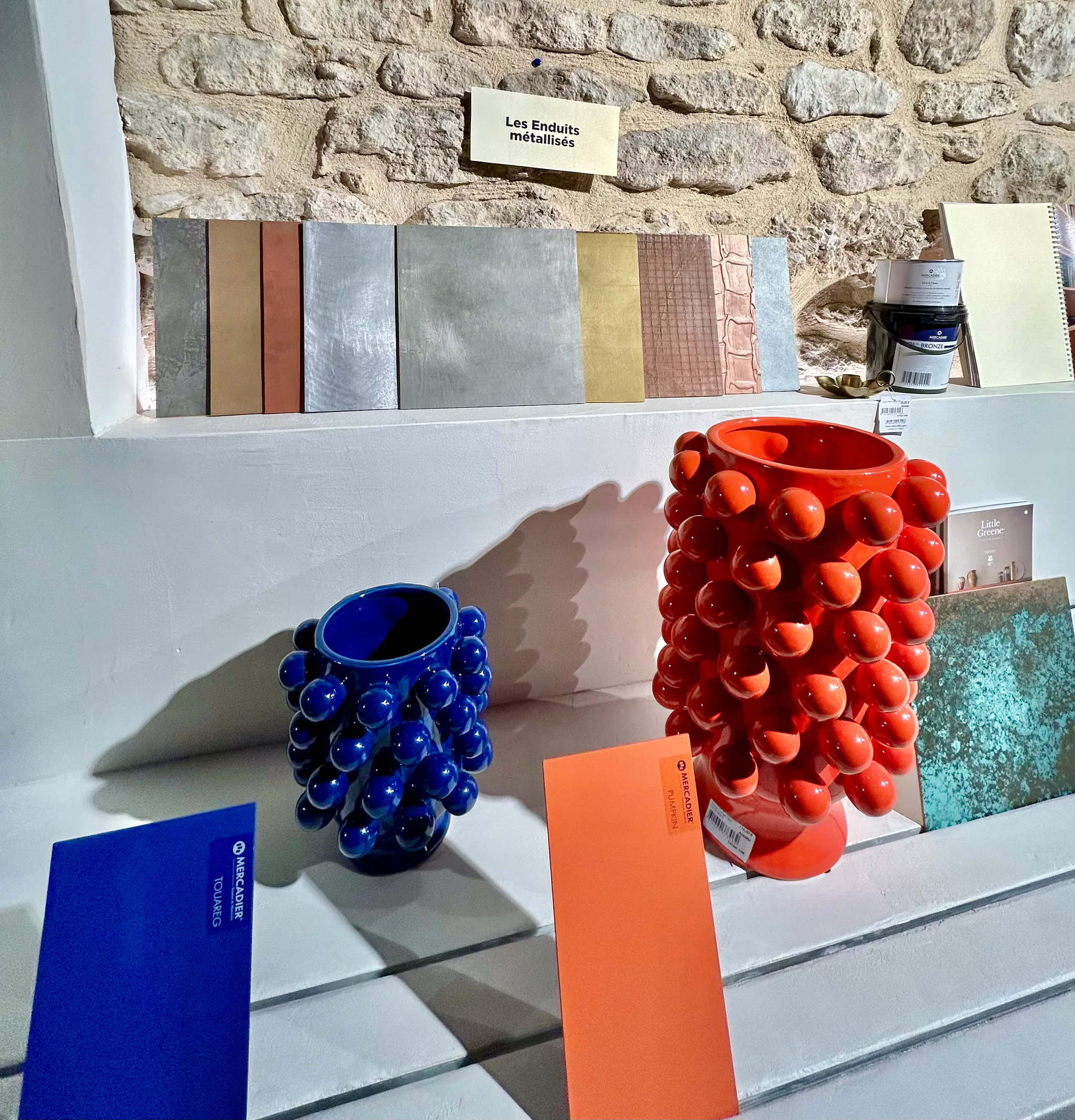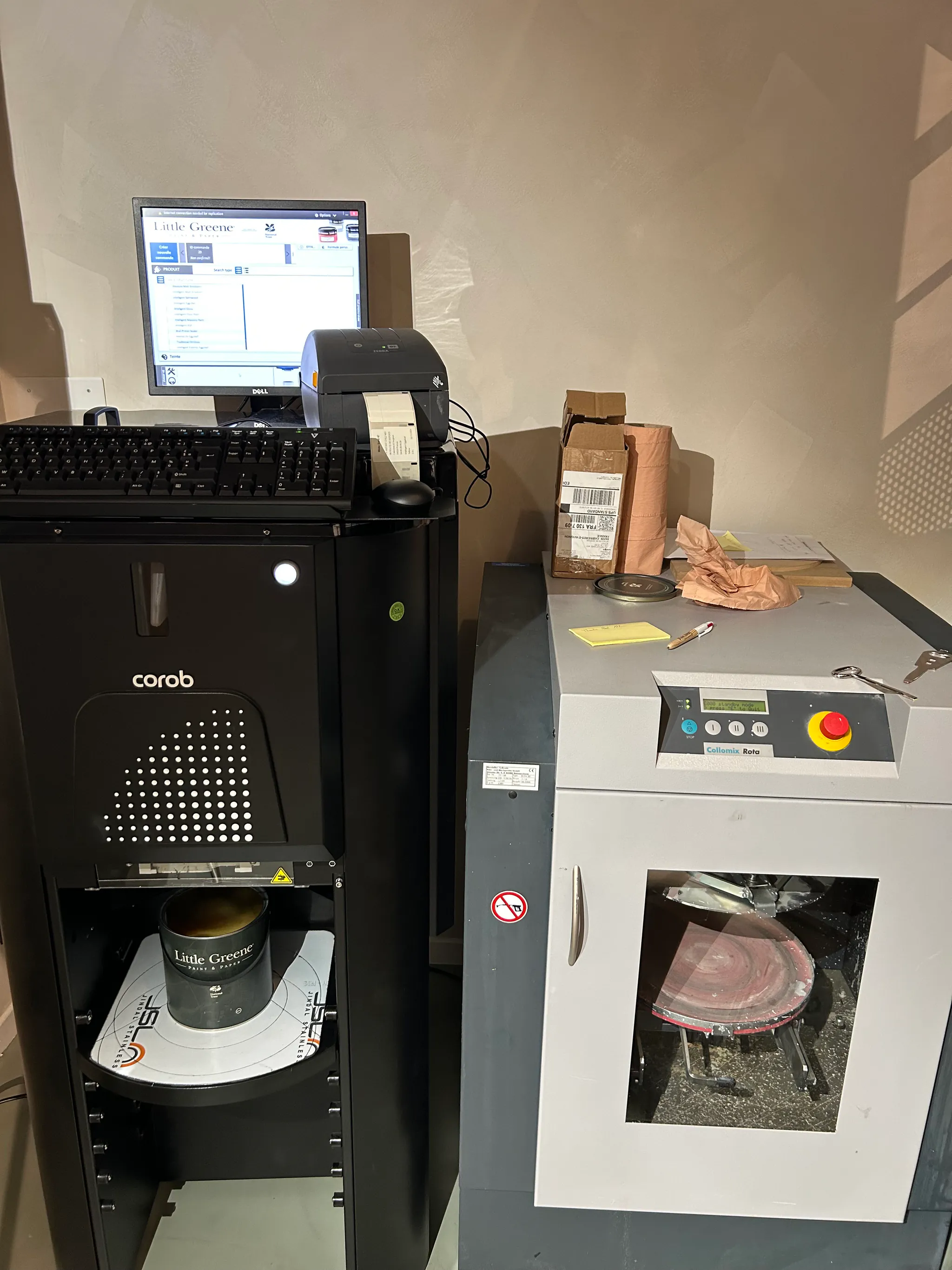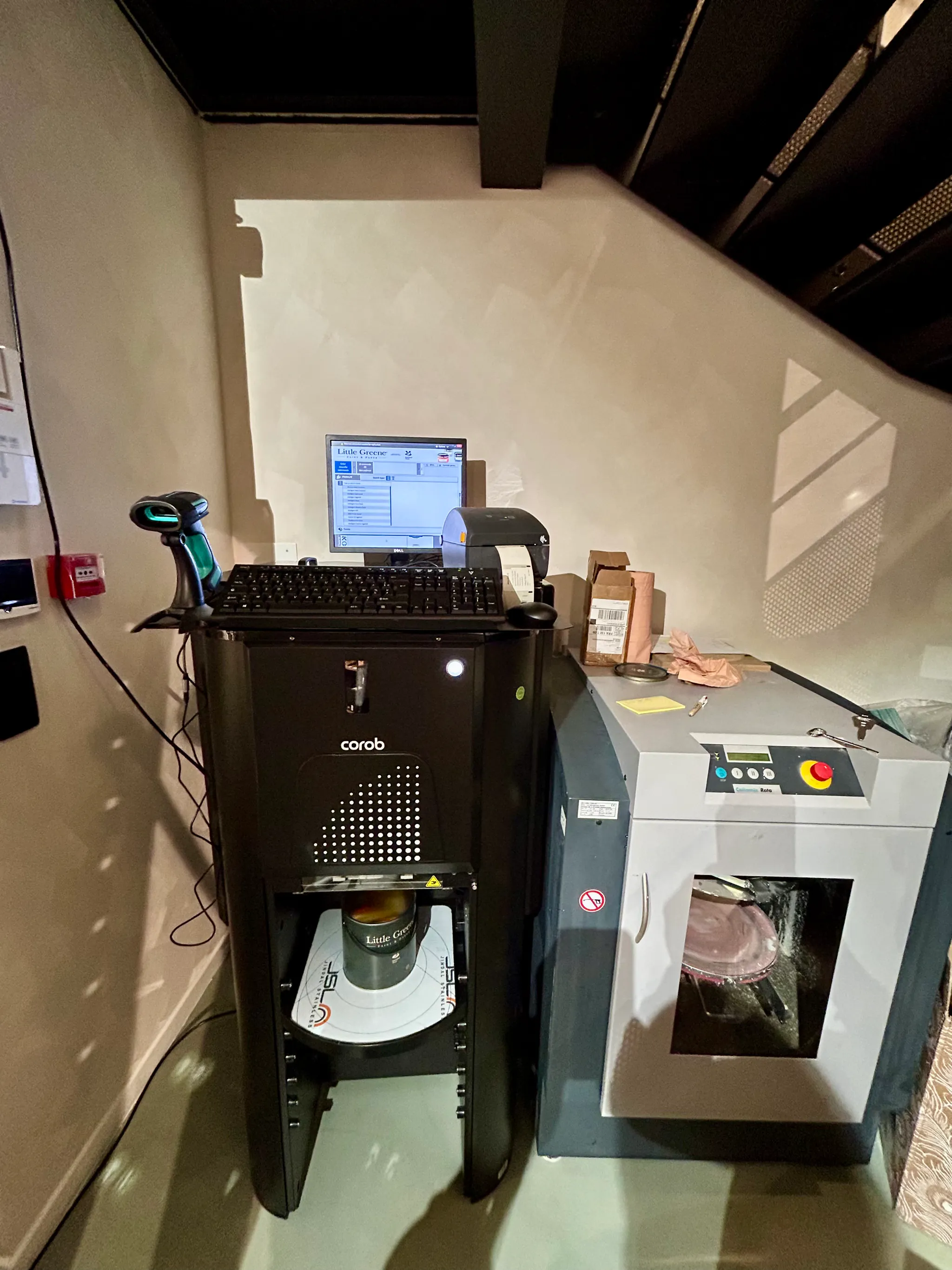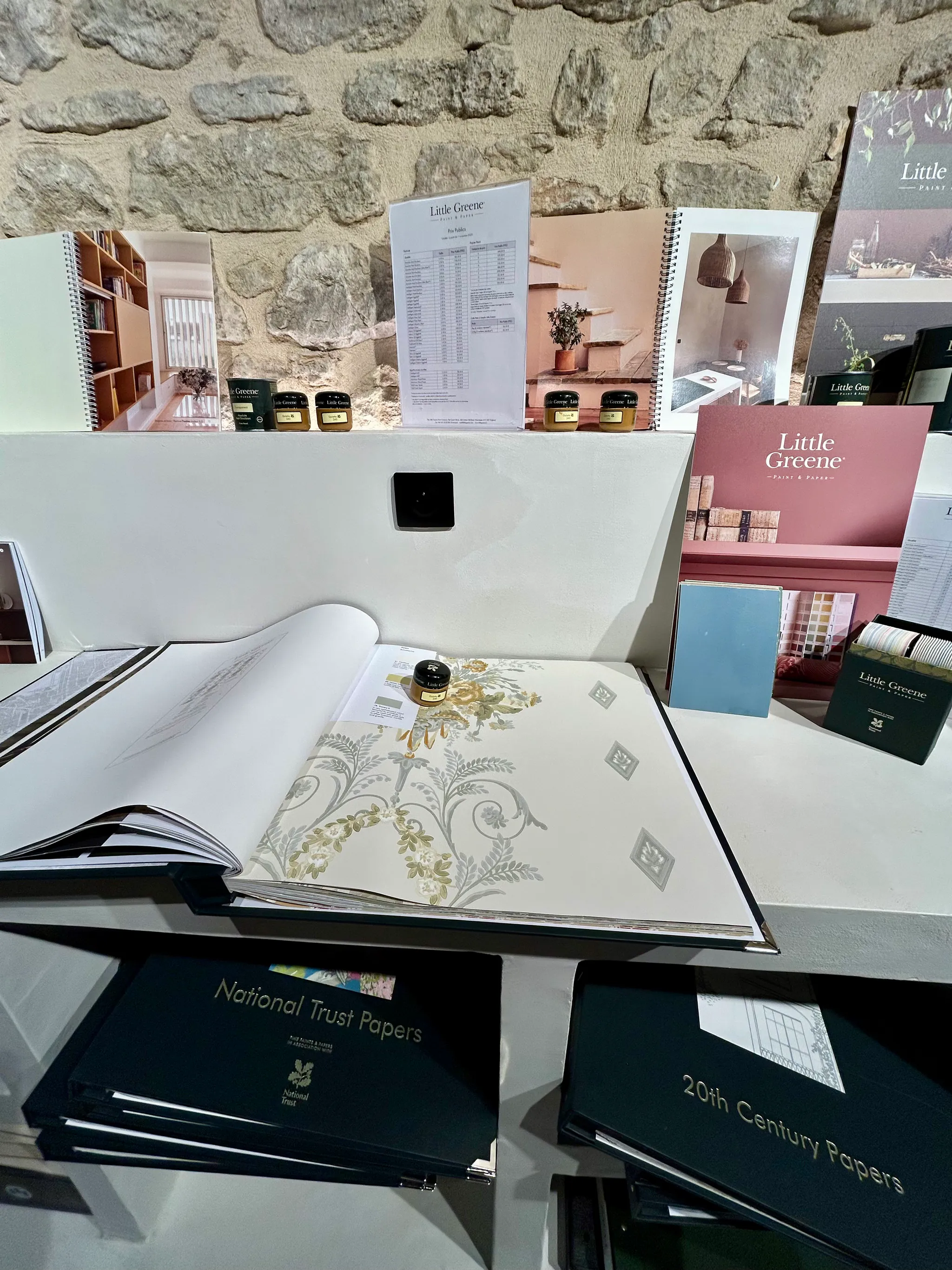 Découvrez notre showroom unique avec sa machine à teinter Little Greene et une sélection complète de matériaux et échantillons.